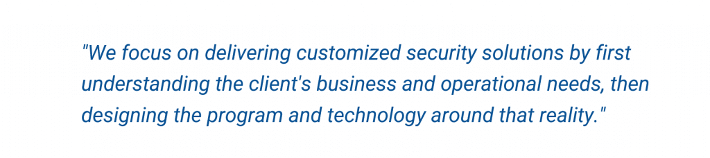 Nomani: We specialize in K-12 schools, higher education, corporate and Fortune 500 companies, pharmaceuticals, utilities, and hospitals. What’s consistent across those markets is our approach: we focus on delivering customized security solutions by first understanding the client’s business and operational needs, then designing the program and technology around that reality.